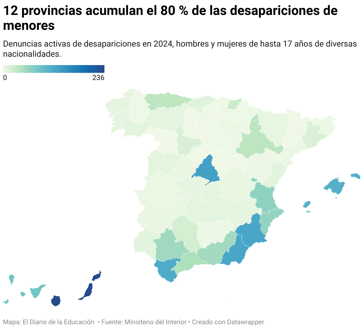 Las Palmas, Santa Cruz de Tenerife, Cádiz, Almería, Murcia. Baleares o Madrid son los territorios que mayor cantidad de niñas, niños y adolescentes extranjeros desaparecidos condensaron en 2024.