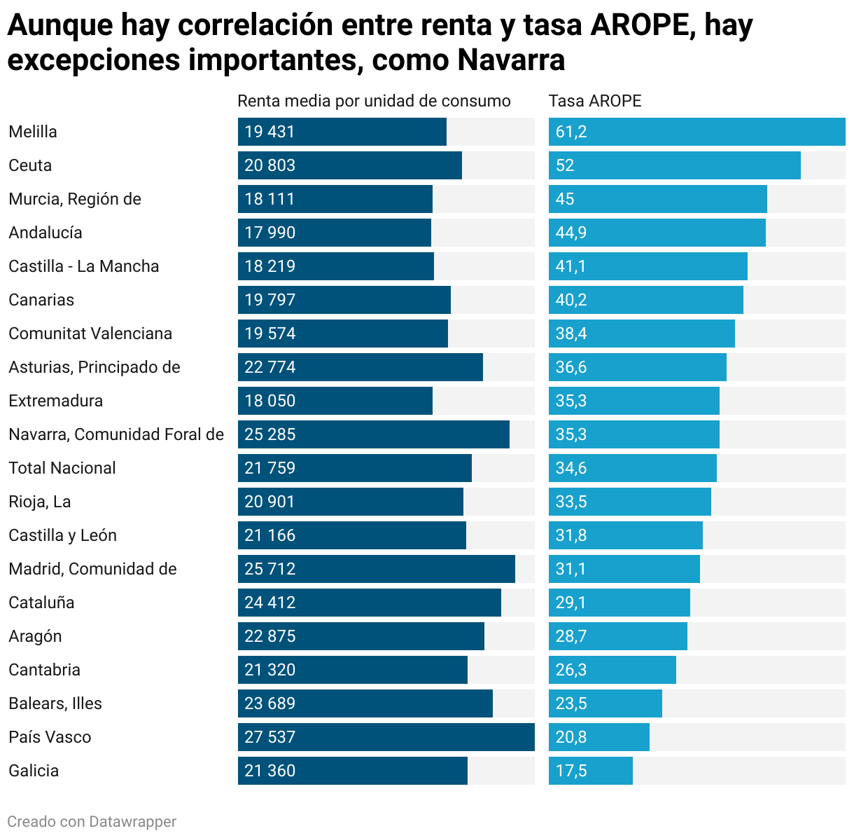 Hay importantes diferencias entre los territorios. Mientras que Galicia, por ejemplo tiene una tasa AROPE del 17,5 %, Murcia tiene casi 30 puntos porcentuales más. Sin contar con las ciudades autónomas, muy por encima de la media estatal. La renta media por unidad de consumo, aunque no es un predictor infalible, habla de que a mayor renta, menor tasa de pobreza infantil. Aunque otros factores inciden en esta relación, como las desigualdades salariales internas a la comunidad, las políticas sociales, el coste de la vida o la estructura laboral y salarial.