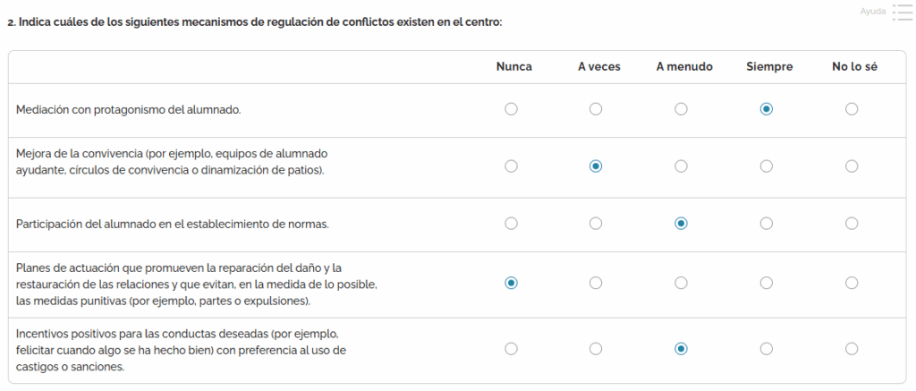 Por ejemplo, el cuestionario para las direcciones de centro indaga sobre los procesos de toma de decisiones, la implicación del alumnado en la convivencia y el cuidado en el centro (planes de mediación, establecimiento de normas, prácticas restaurativas, limpieza del espacio y gestión de los residuos…); la participación de las familias y la comunidad educativa o el tipo de empresas gestoras de los servicios externos, etc. La mirada sobre estas y otras cuestiones se amplía y complementa mediante los cuestionarios al resto de la comunidad educativa. Mientras tanto, los del profesorado y del alumnado indagan además sobre el trabajo en aula: aprendizajes ecosociales; uso de metodologías activas e inclusivas; puesta en práctica de una evaluación competencial, formativa y formadora; la inclusión de la perspectiva ecosocial en la programación o la incorporación de esta mirada en la organización de viajes de estudio, entre otras cuestiones.