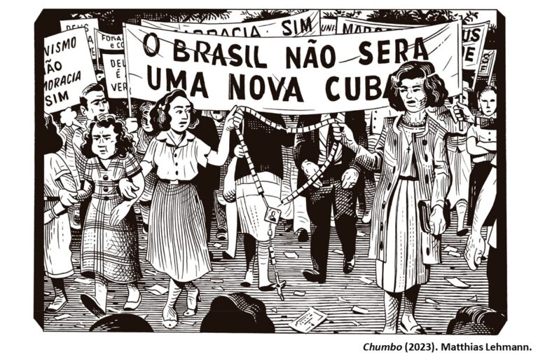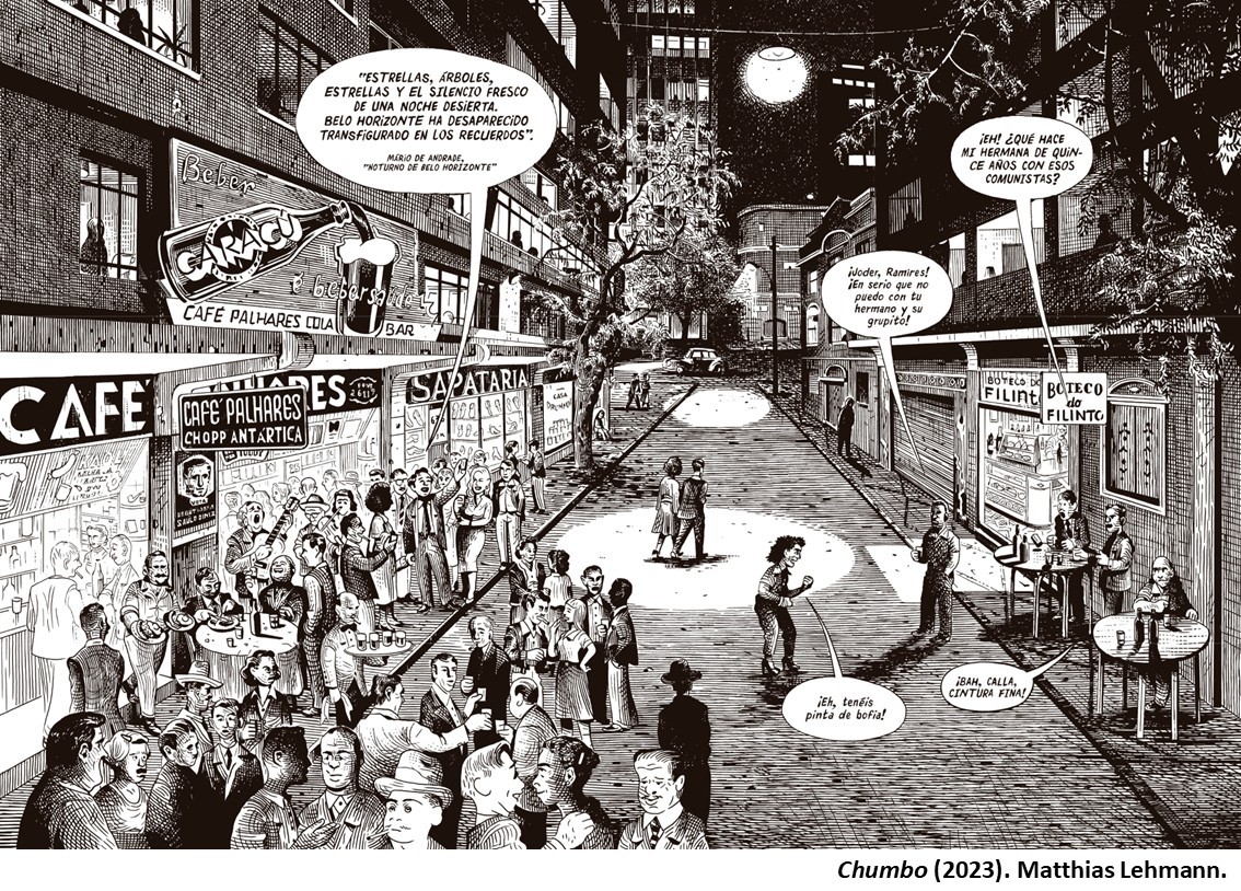 Esa sesión de formación que recordó Dilma Rousseff de cómo torturar a los prisioneros aparece dibujada en la novela gráfica Chumbo (2023), del autor franco-brasileño Matthias Lehmann, y que publica en octubre de 2025 en castellano Ediciones La Cúpula, con traducción del francés original de Eva Reyes de Uña y tipografía de iris Bernárdez, una tarea importante en el diseño de la obra. «Chumbo», en portugués, significa «plomo», y hace referencia a «los años de plomo» que es cómo se conoce históricamente al período más cruento de la dictadura militar, donde destaca trágicamente el lustro 1969-1974 bajo la presidencia de Emílio Garrastazu Médici (1905-1985), proclamado por la Junta Militar tras el fallecimiento del anterior dictador. Su firme decisión de acabar con cualquier tipo de oposición, le llevó a ordenar todo tipo de torturas a los detenidos para conseguir sus fines, mientras controlaba la prensa y la actividad política del país. El título Chumbo en la versión original y sus respectivas traducciones funciona ahora como un grito de denuncia, en una década en que, no olvidemos, una gran parte de la sociedad civil votó en 2018 a Bolsonaro para convertirlo en presidente de la república.