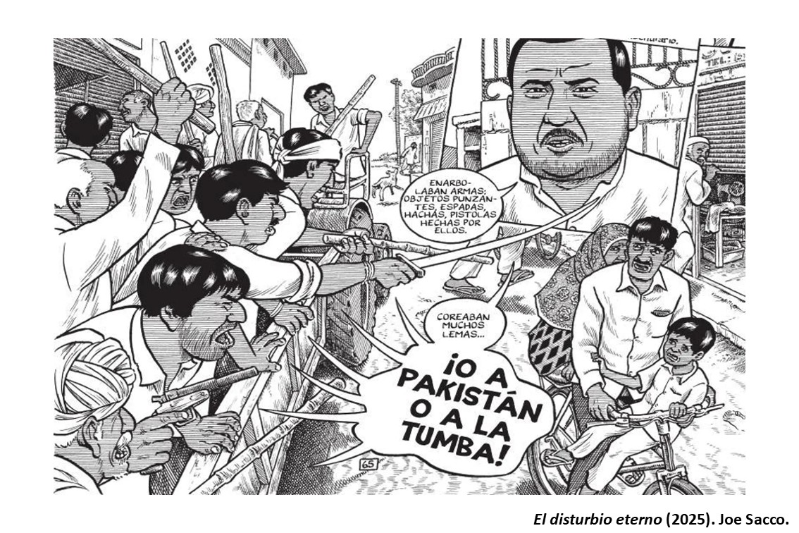 Sacco recuerda someramente cómo la caída del Imperio Británico propició la división del territorio en zonas sectarias: «hablando en plata, India para los hindúes y Pakistán para los musulmanes», afirma en una de las viñetas. «La partición fue una catástrofe humanitaria. Más de 12 millones de personas fueron expulsadas de sus casas o huyeron a uno u otro lado para evitar formar parte de una población minoritaria», un desplazamiento que causó más de un millón de muertes en los años posteriores a la independencia. «Hoy en día, los musulmanes representan menos del 14% del total de la ciudadanía», aunque durante décadas estuvieron relativamente seguros en una nación que se había proclamado laica y cuyos gobernantes consideraban a sus habitantes por igual.